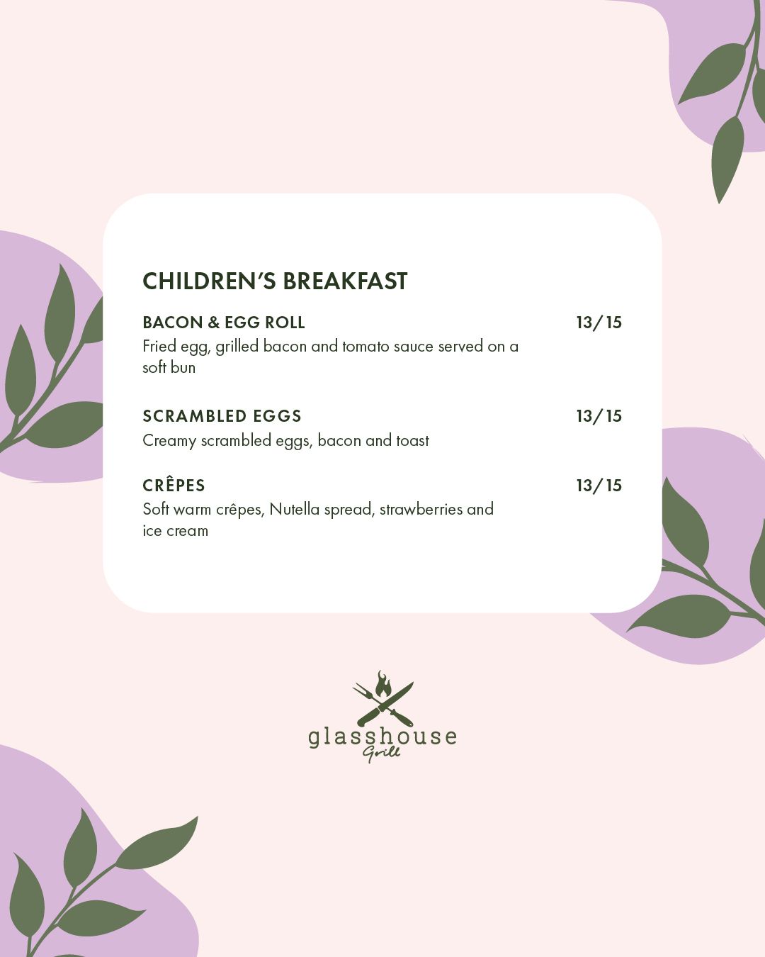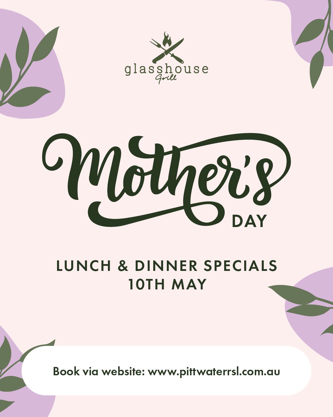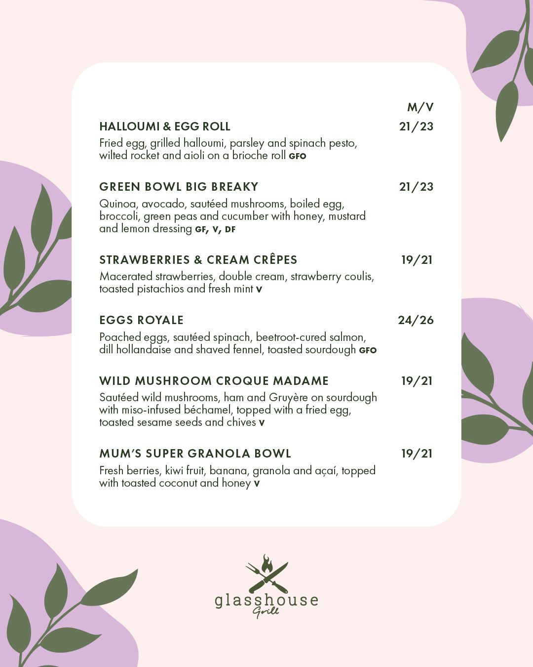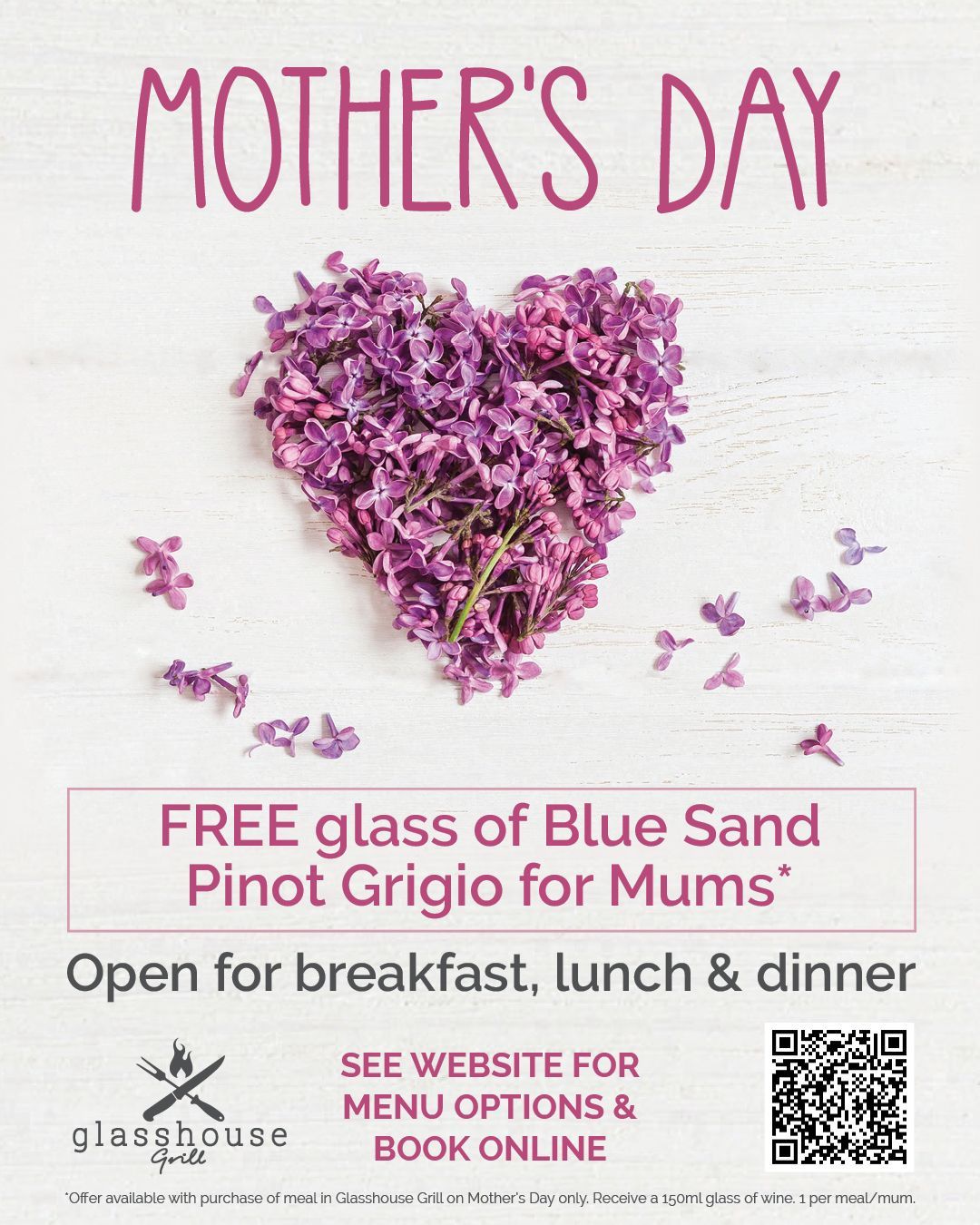 *Offer available with purchase of meal in Glasshouse Grill on Mother's Day only. Receive a 150ml glass of wine. 1 per meal/mum!